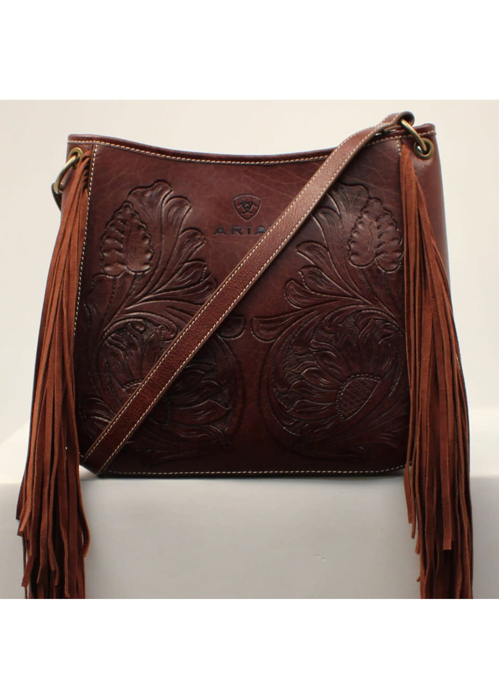 Ariat Victoria crossbody bag by M&F Western Products. Brown floral tooled genuine leather with brown suede fringe on the sides. Gun pocket on the back with left and right hand access. Top snap closure to keep your belongings safe.