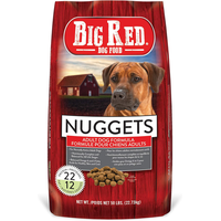 - Big Red Nuggets Adult Dog Food. 50lb Dog Food. 22% Protein/12% Fat. For Normally Active Adult Dogs. Nutritionally Complete and Balanced for All Life Stages. Balanced Omega 6 and 3 Fatty Acids for Healthy Skin and Coat.