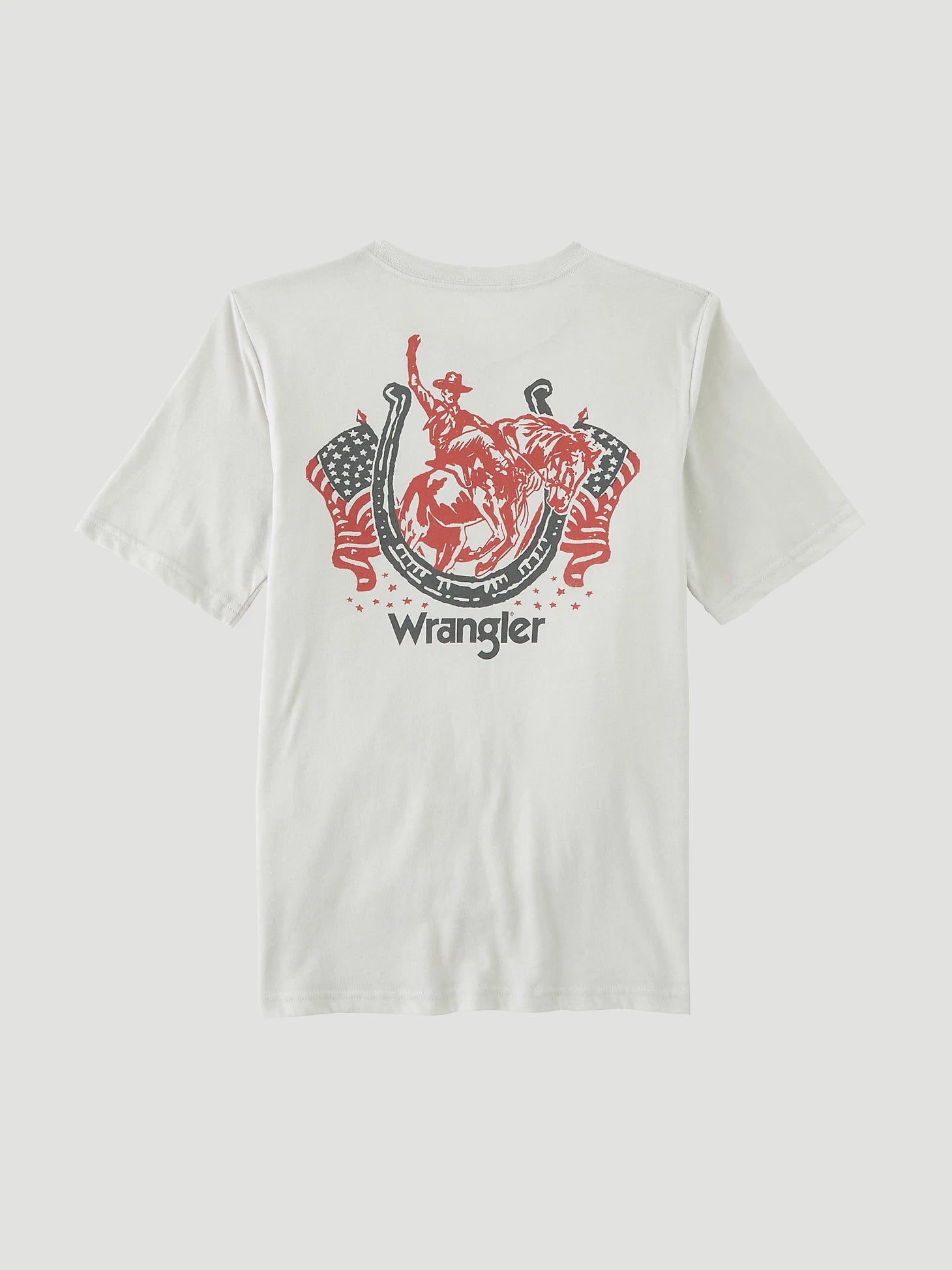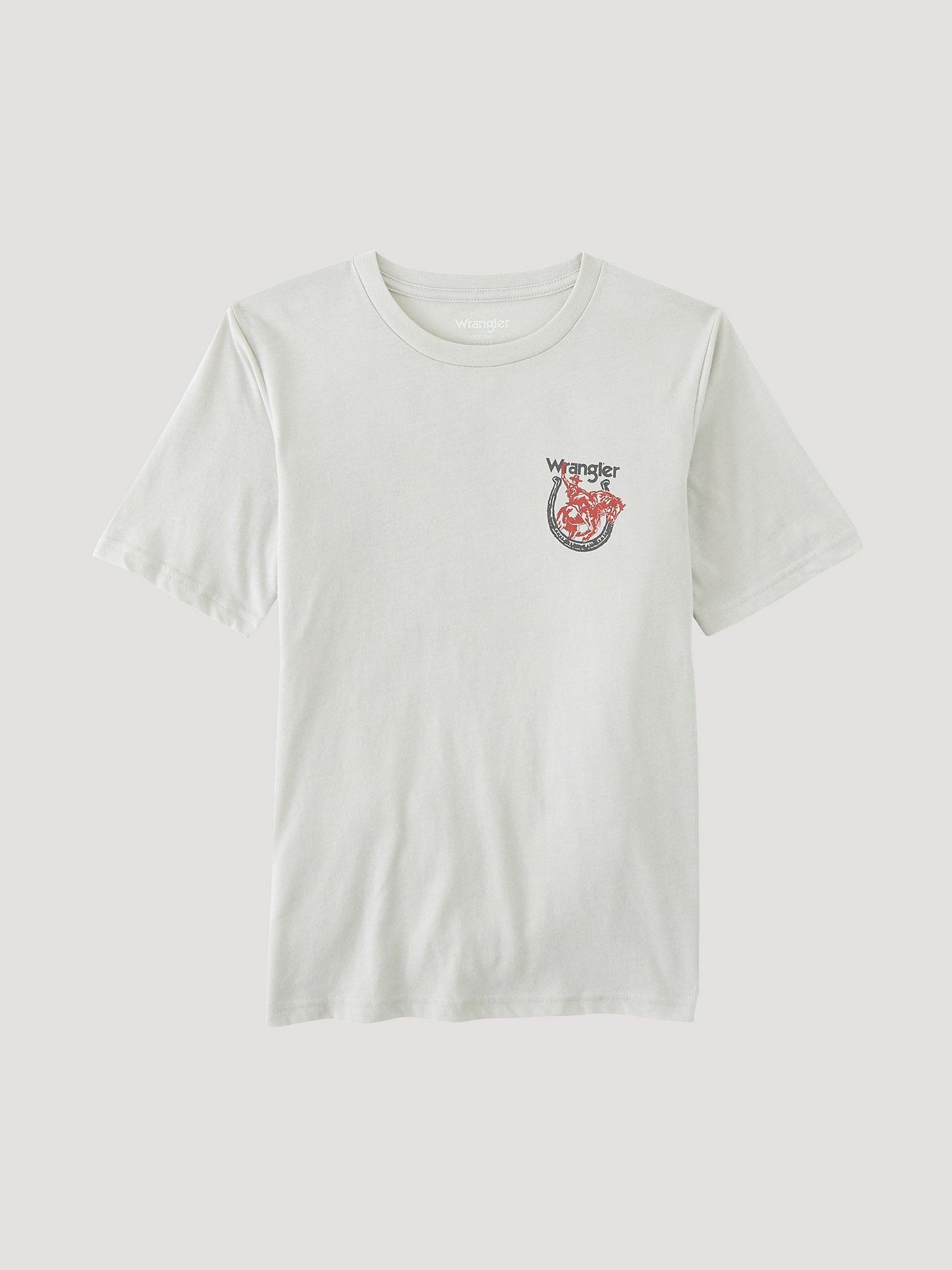 There’s no better way to live than on the back of a horse. Luckily, our Boy’s Wrangler® Back Horseshoe Graphic T-Shirt gets it. It comes with matching retro-inspired graphic prints from front to back of a bronc rider in action along with a horseshoe and the Wrangler logo.