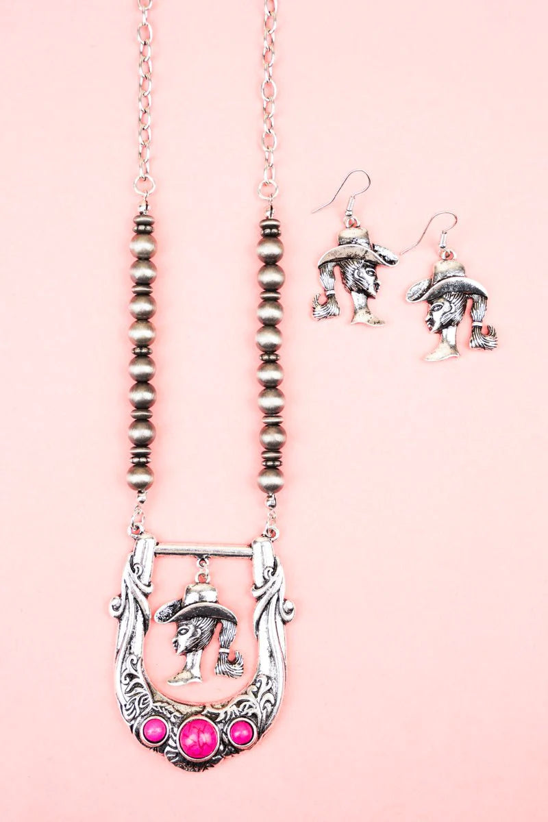 RANCHER STYLE PINK COWGIRL BELT BUCKLE NECKLACE AND EARRING SET