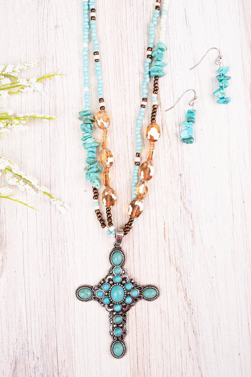 Turquoise Bosler Cross Beaded Necklace and Earring Set