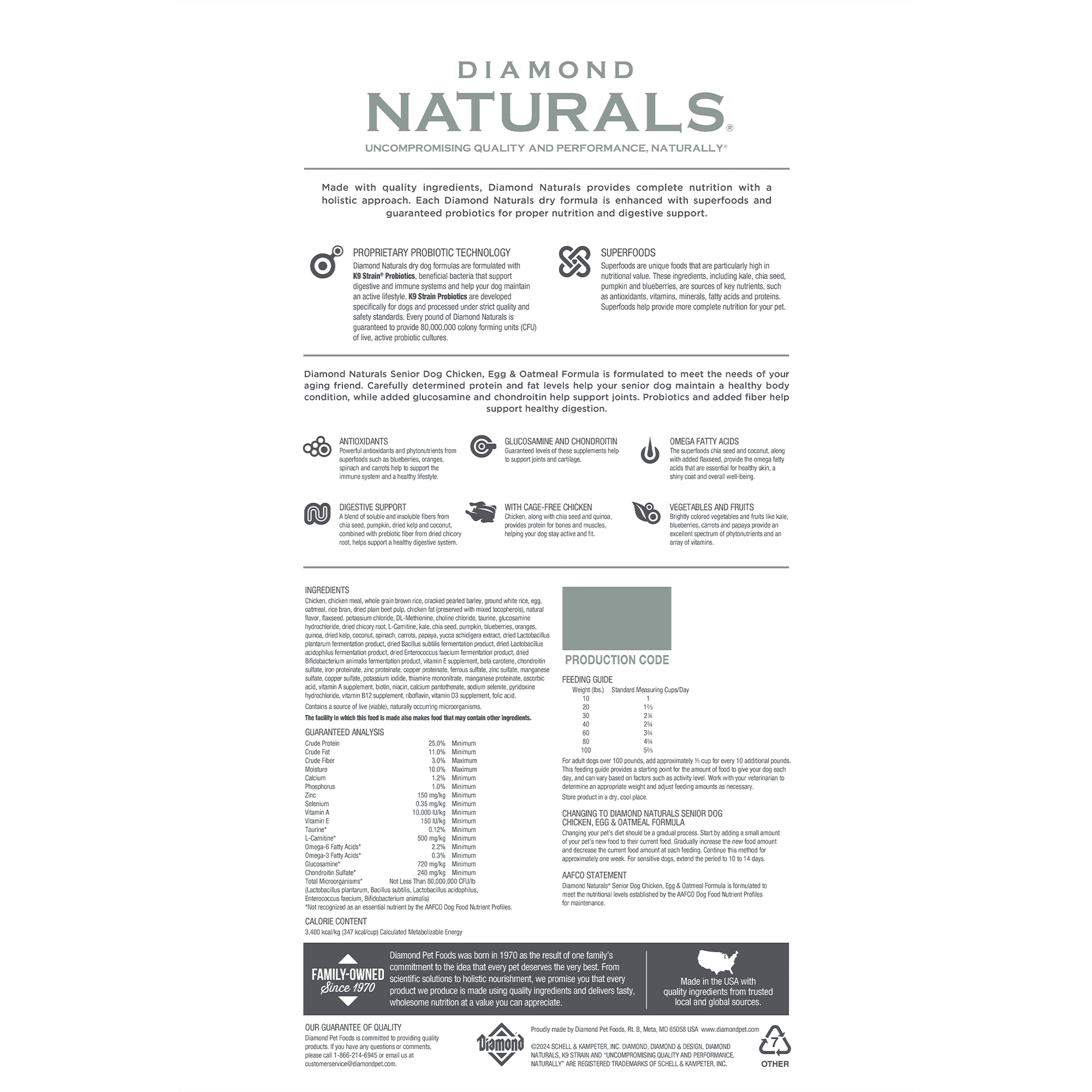 Ingredients: Chicken, chicken meal, whole grain brown rice, cracked pearled barley, ground white rice, egg, oatmeal, rice bran, dried plain beet pulp, chicken fat (preserved with mixed tocopherols), natural flavor, flaxseed, potassium chloride, DL-Methionine, choline chloride, taurine, glucosamine hydrochloride, dried chicory root, L-Carnitine, kale, chia seed, pumpkin, blueberries, oranges, quinoa, dried kelp, coconut, spinach, carrots, papaya, yucca schidigera extract, dried Lactobacillus plantarum fermentation product, dried Bacillus subtilis fermentation product, dried Lactobacillus acidophilus fermentation product, dried Enterococcus faecium fermentation product, dried Bifidobacterium animalis fermentation product, vitamin E supplement, beta carotene, chondroitin sulfate, iron proteinate, zinc proteinate, copper proteinate, ferrous sulfate, zinc sulfate, manganese sulfate, copper sulfate, potassium iodide, thiamine mononitrate, manganese proteinate, ascorbic acid, vitamin A supplement, biotin, niacin, calcium pantothenate, sodium selenite, pyridoxine hydrochloride, vitamin B12 supplement, riboflavin, vitamin D3 supplement, folic acid.