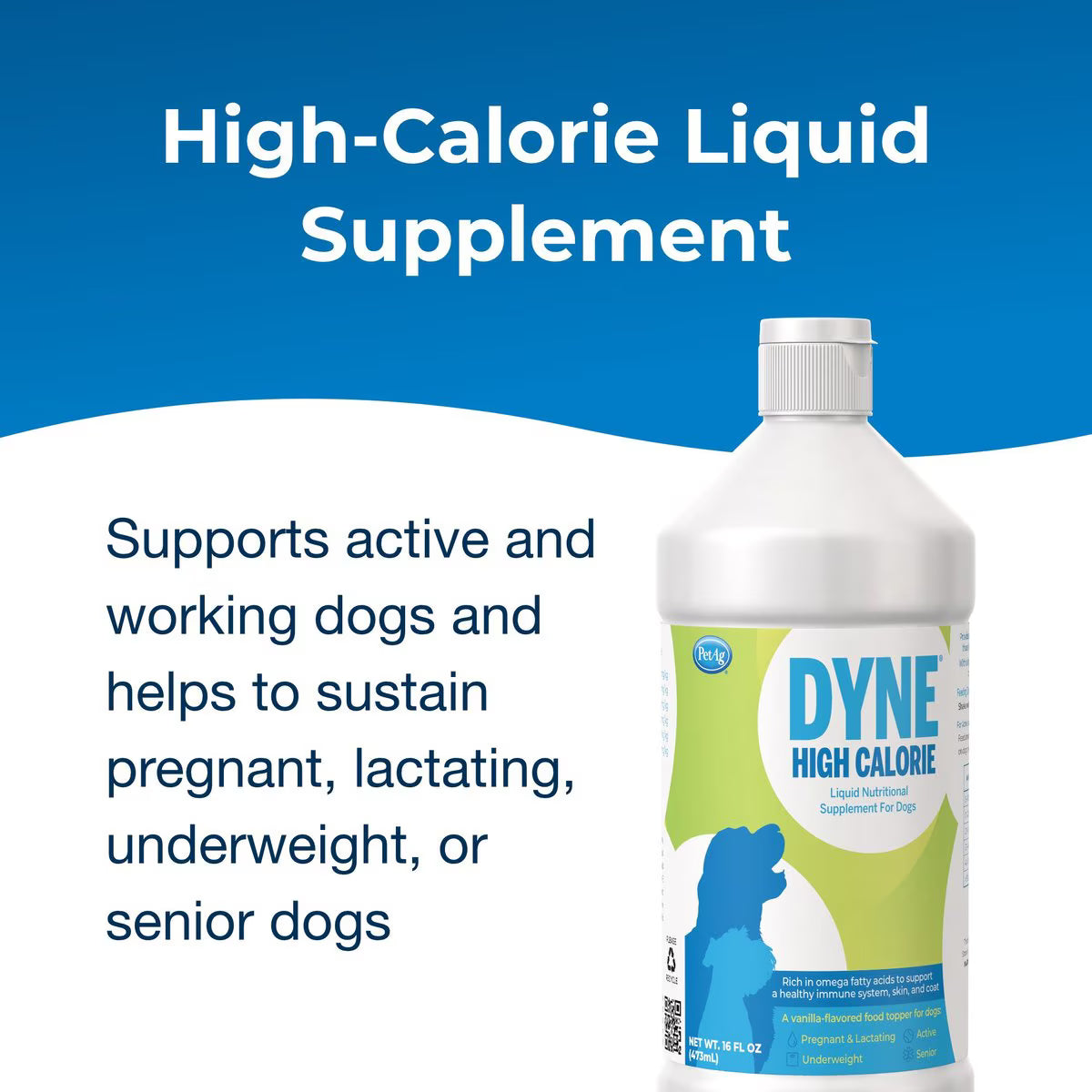 Dyne High Calorie Liquid Supplement: Boosts health with essential vitamins and calories for livestock and working dogs. Vanilla flavor encourages feeding.