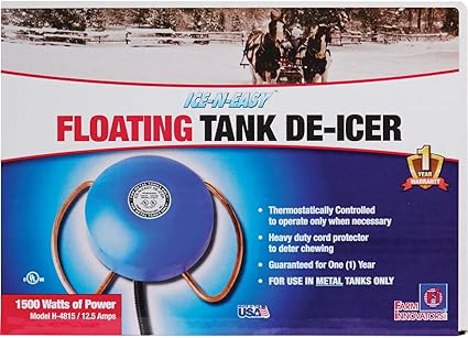 The Farm Innovators 1,500W Floating Tank De-Icer for Metal Stock Tanks Up to 70-250 gal. will keep water in metal tanks from completely freezing during the winter. It's thermostatically controlled to operate only when necessary.
