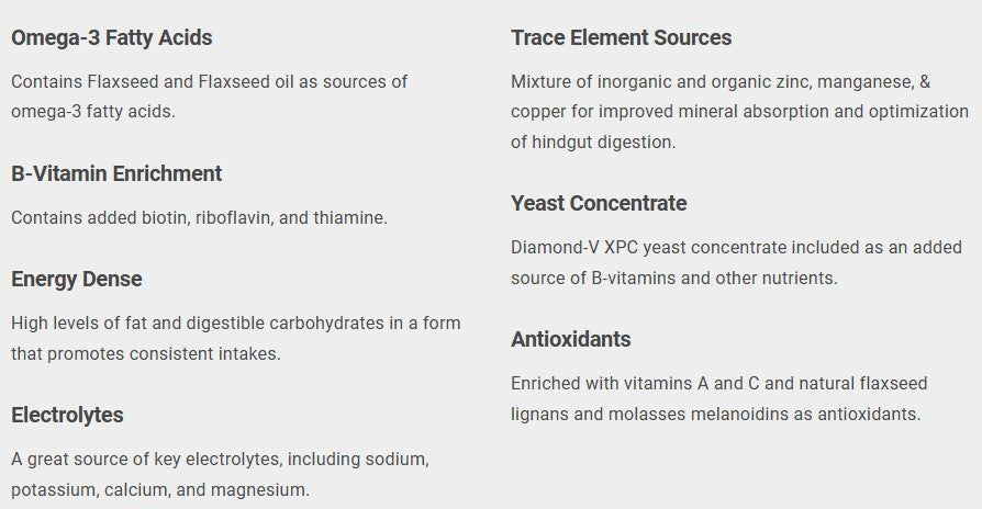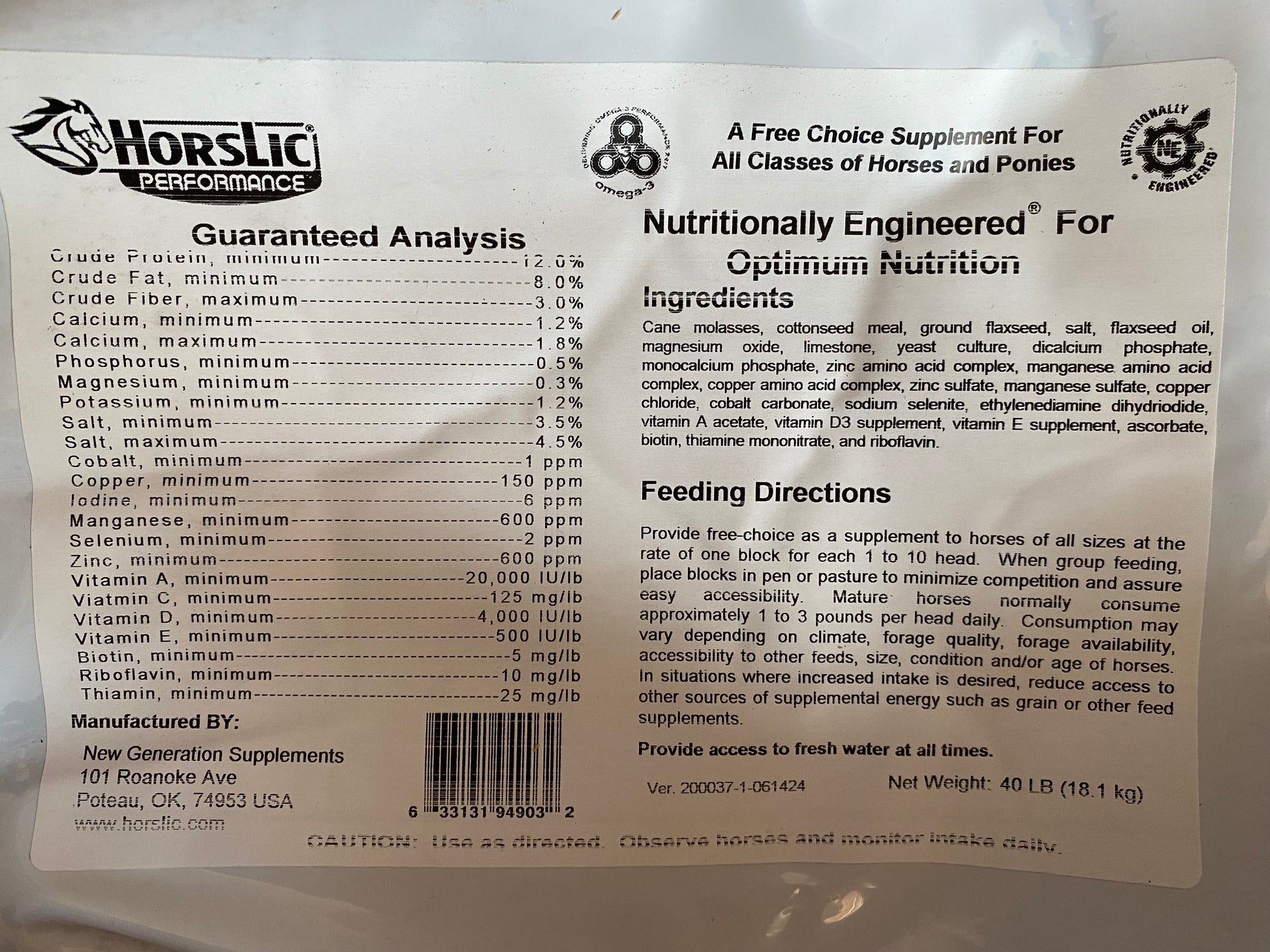 Ingredients: Cane molasses, cottonseed meal, ground flaxseed, salt, flaxseed oil, magnesium oxide, limestone, yeast culture, dicalsium phosphate, monocalcium phosphate, zinc amino acid complex, manganese amino acid complex, copper amino acid complex, zinc sulfate, manganese sulfate, copper chloride, cobalt carbonate, sodium selenite, ethylenediamine dihydriodide, vitamin A acetate, vitamin D3 supplement, vitamin E supplement, ascorbate, biotin, thiamine mononitrate, and riboflavin.Feeding Directions:Provide free choice as a supplement to horses of all sizes at the rate of one block for each 1 to 10 head. When group feeding, place blocks in pen or pasture to minimize competition and assure easy accessibility. Mature horses normally consume approximately 1 to 3 pounds per head daily. Consumption may vary depending on climate, forage quality, forage availability, accessibility to other feeds, size, condition and/or age of horses. In situations where increased intake is desired, reduce access to other sources of supplemental energy such as grain or other feed supplements. Provide access to fresh water at all times.