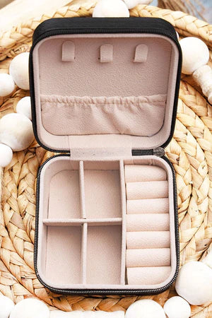 This small travel jewelry box features a zip closure and multiple compartments to organize rings, earrings, bracelets, necklaces, or other small pieces.