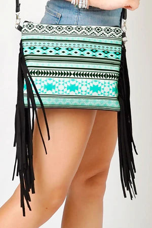 L.I.B. NEW YORK MACKENZIE MESA FRINGE CROSSBODY CLUTCH, BLACK
