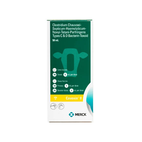 Merck Animal Health Bovilis Covexin 8 cattle vaccines aid in the prevention of cattle and sheep related issues such as: blackleg, malignant edemas, black disease, red water, enterotoxemia, and tetanus. Administering a 5mL dose of these sheep and cow vaccines to your sheep and cows can help them continue to perform at their best. Inject these sheep and cattle parasite control products into the subcutaneous or the intramuscular layer to prevent disease caused by exposure to Clostridium chauvoei, C. septicum, C. novyi Type B, C. haemolyticum (known also as C. novyi Type D), C. tetani and C. perfringens Types C and D.