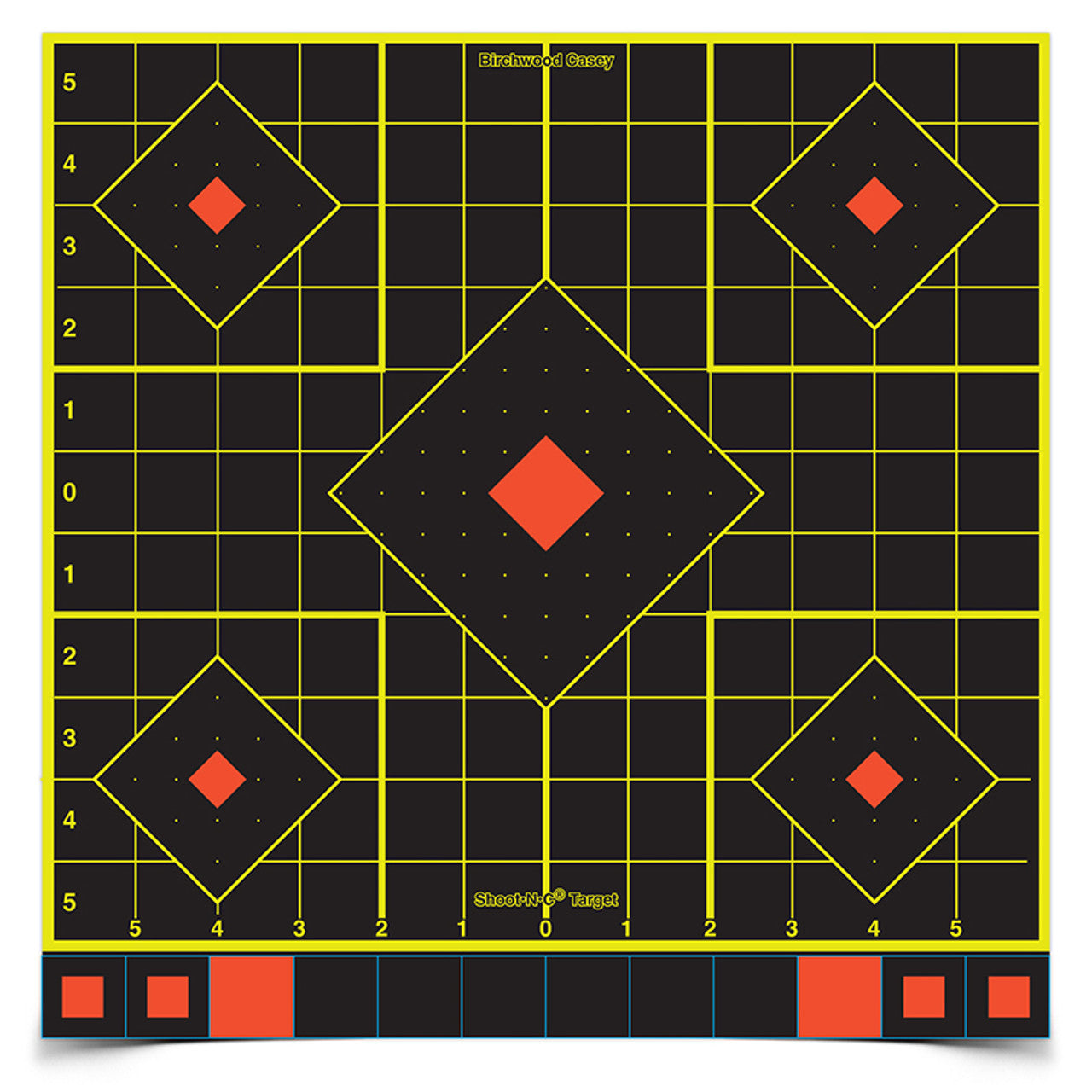 Five targets on each sheet – use center target for sighting-in and four smaller targets for testing results of various ballistic loads or for confirmation of sight-in groups. Convenient 1-inch numbered grid lines simplify scope adjustments.