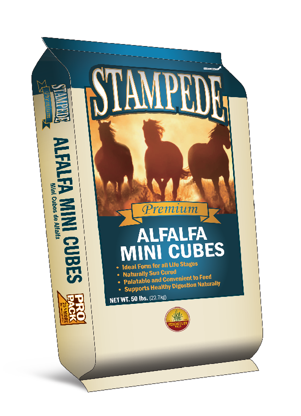 Feeding Directions: Stampede Alfalfa Cubes can be fed as is right out of the bag or they can be soaked to facilitate mixing a grain and forage mash but soaking is not necessary. Substitute normal hay with Alfalfa Cubes on a weight for weight basis. Stampede Alfalfa Cubes can be fed as the sole forage source, used as part of the forage program or fed as a treat. Feed Alfalfa Cubes off the ground in the pasture or in your horse’s feeder. When fed as the sole forage source be sure to feed at least 10 pounds or more per horse per day. The amount fed should be adjusted to maintain the horse’s desired body condition and energy level.