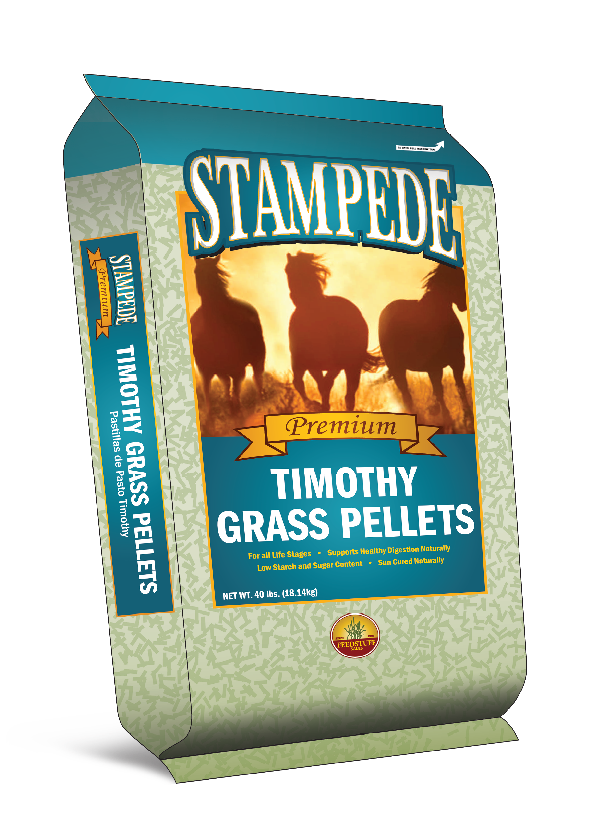 Feeding Directions: Stampede Timothy Grass pellets can be fed as is right out of the bag or they can be soaked to facilitate mixing a grain and forage mash but soaking is not necessary. Substitute normal hay with Timothy Grass Pellets on a weight for weight basis. Stampede Timothy Grass Pellets can be used as part of the forage program to supplement pasture or extend available hay sources. Be sure to feed the equivalent of at least 5 pounds per day of pasture and/or hay when feeding Timothy Grass Pellets.