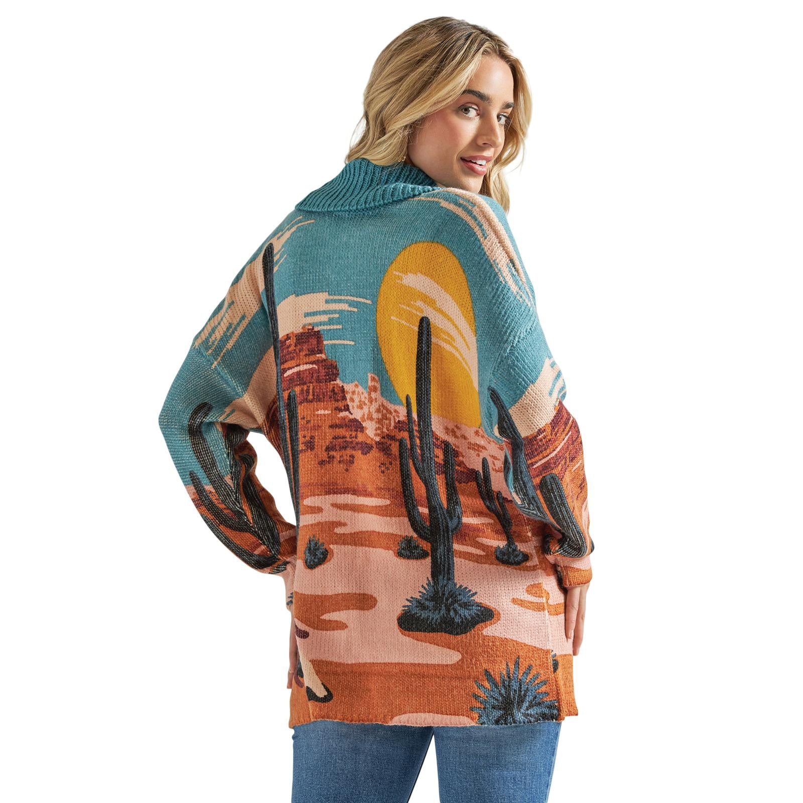Whether you're ready to ride off into the sunset or kick back and relax, our Women's Wrangler Retro Deserted Cardigan will keep you cozy. It's crafted for comfort and warmth, with a shawl collar and a brushed finish for extra softness. From front to back, this cardigan is covered in the most colorful desert print full of cacti, steer heads, and mesas all soaked in sunshine.